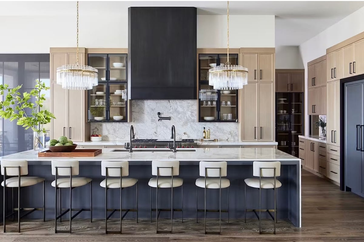 This kitchen, designed by Heidi Caillier, is a strong example of how two-tone cabinetry can introduce contrast without creating visual noise. Cream upper cabinets with glass fronts recede softly into the wall, while deep navy lowers anchor the room and provide weight at eye level. The effect is balanced and architectural rather than decorative.