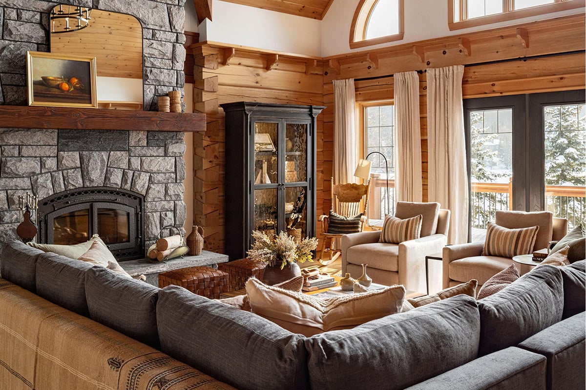 Layering textures is essential in interior design and creates a warm and inviting home. A large area rug, faux fur throw pillows, blankets, and an upholstered accent chair add a cozy touch to the log cabin below.