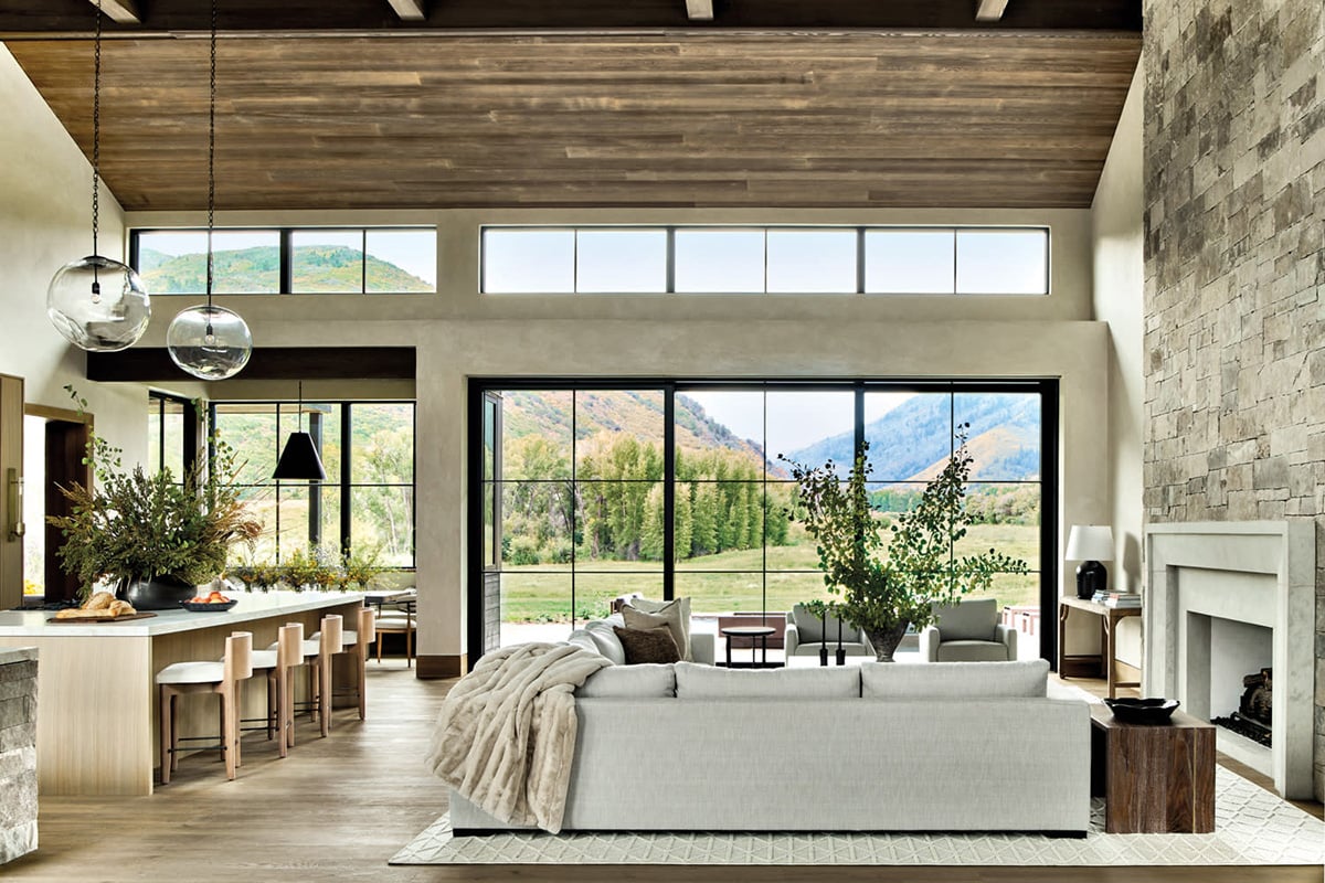 Architect Brent Alm composed a contemporary mountain home anchored around a great room. It features ample windows to frame the scenery and doors that pocket away to seamlessly connect to the exterior. When designing this Colorado retreat, the goal was to create interiors with warmth and depth, combining stone, plaster, and an array of natural wood details to extend the serene surroundings.