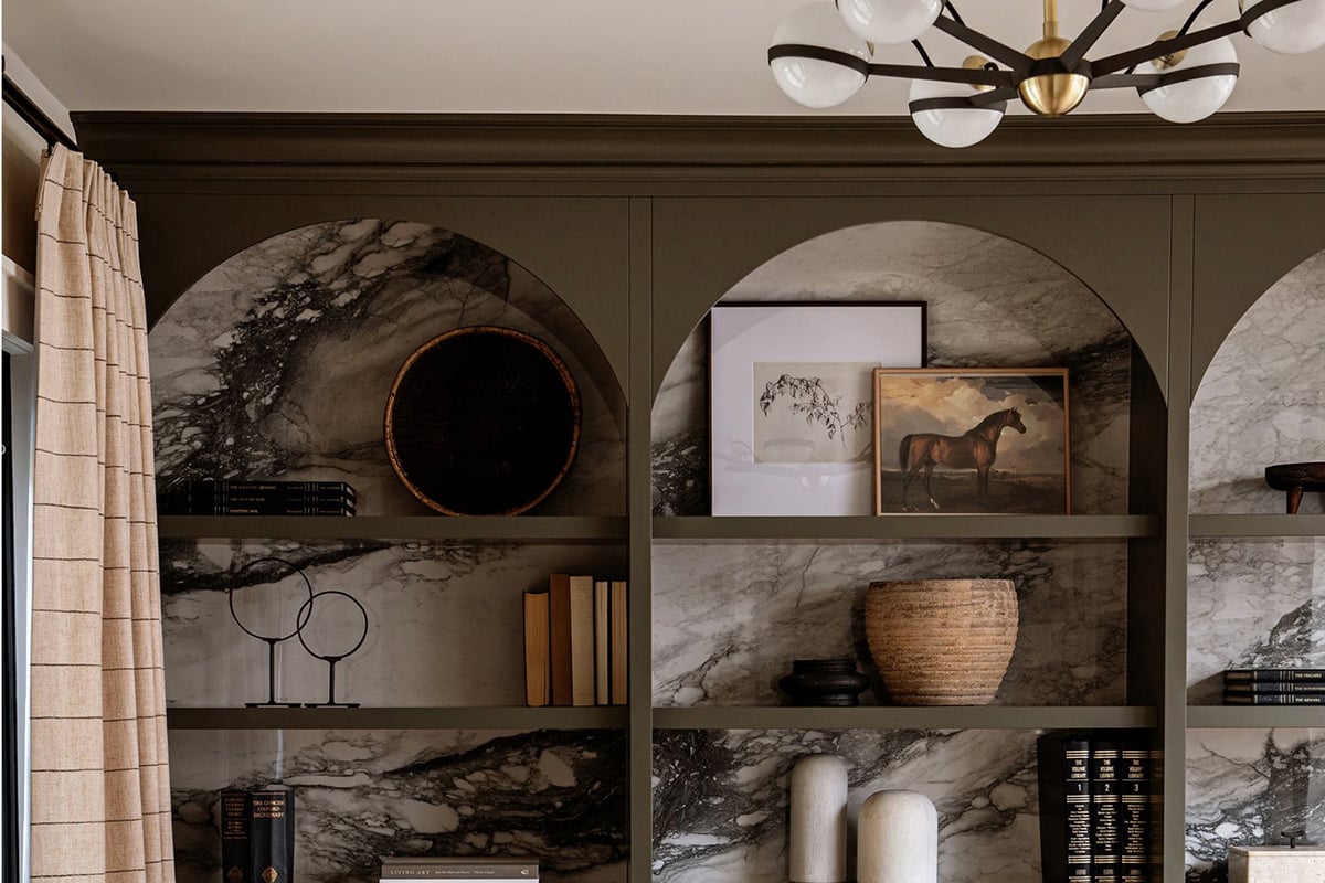 In another stunning home by Karin Bennet, the interior spaces are infused with timeless design elements, a refined aesthetic, and curated details. A custom-built cabinet, in a rich olive green hue and striking arches, takes center stage. I love how Karin incorporated beautifully veined marble as a luxurious backdrop to shelving lined with a collection of decorative objects, artwork, vases, and books.